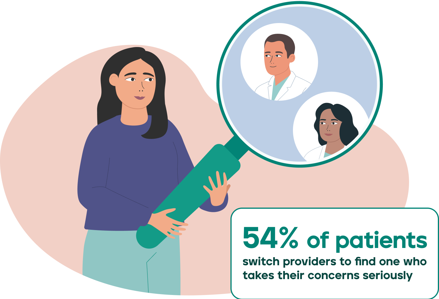 But much of the burden comes from completely unnecessary - and downright unjust - hurdles and stressors patients face. Increasingly, patients are speaking up about “medical gaslighting”, or the experience of having a medical professional dismiss, ignore, or trivialize a patient’s legitimate health concerns. An astounding 66% of patients experience medical gaslighting during their diagnosis journey. Specifically, 45% had their symptoms attributed primarily to a mental health condition such as anxiety, depression, or stress, and 43% had their symptoms attributed primarily to their being “overweight”.